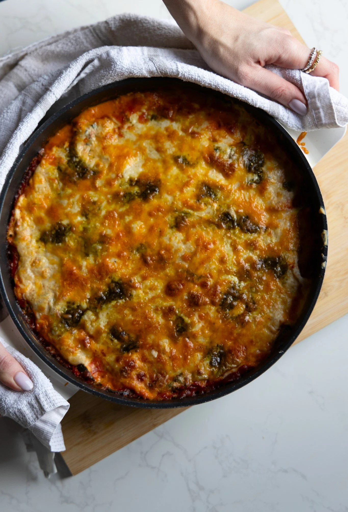 Did someone say comfort food but make it nourishing? This one pot lasagne is exactly that. It is filled with protein, fibre, healthy fats and complex carbs, and most importantly, joy. A rich tomato base, topped with a creamy ricotta and spinach layer, an easy béchamel sauce, dollops of delicious pesto and lots of cheese to make this the ultimate weeknight dinner.