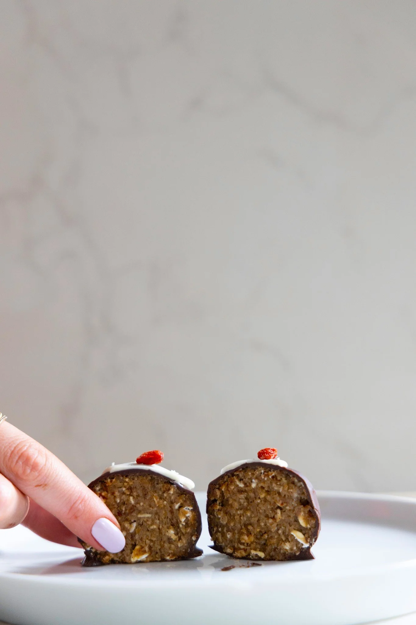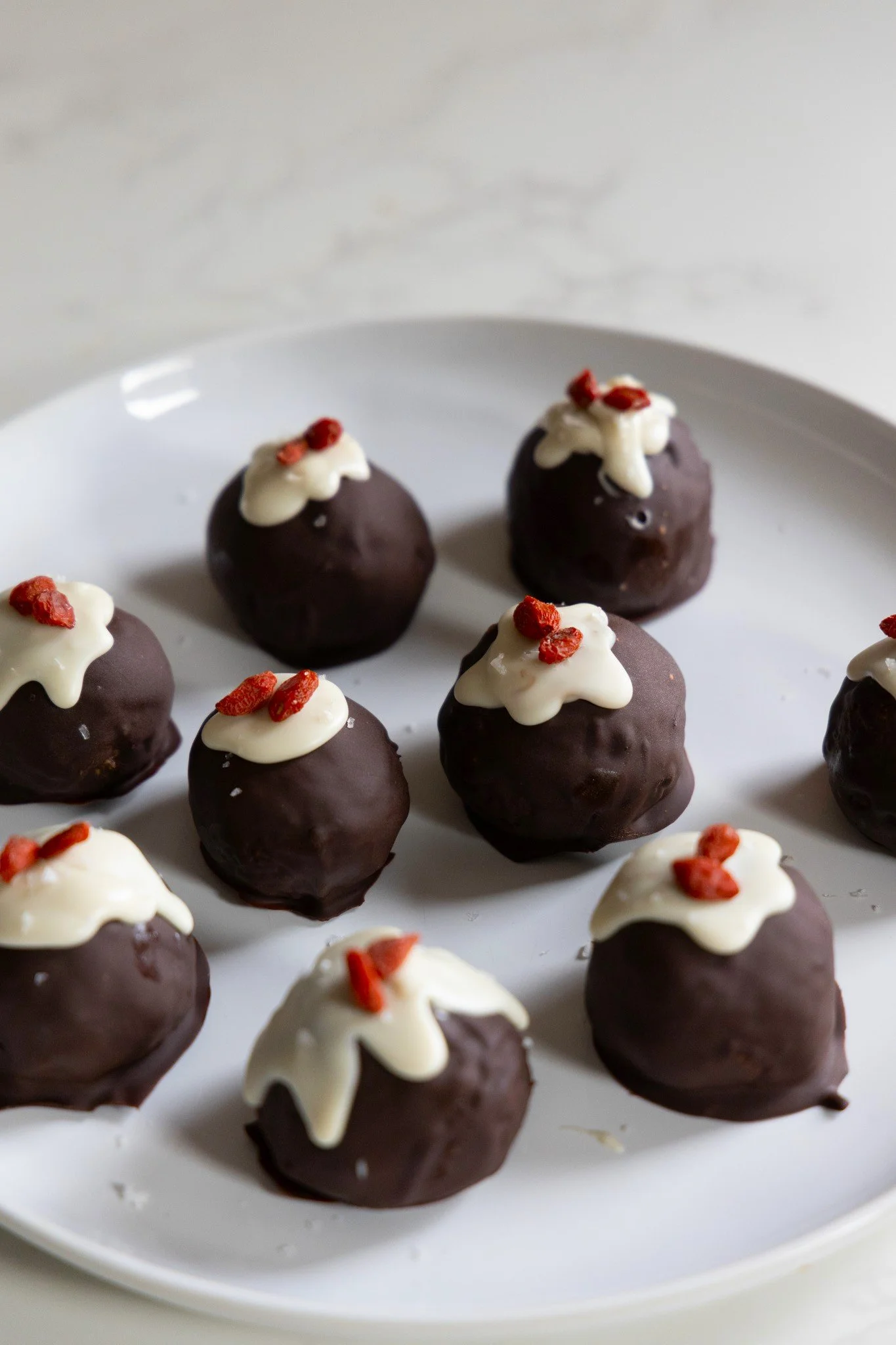 3. Refrigerate for another hour to let them set before drizzling some melted white chocolate on top, crowning them with a goji berry. Chill to set.