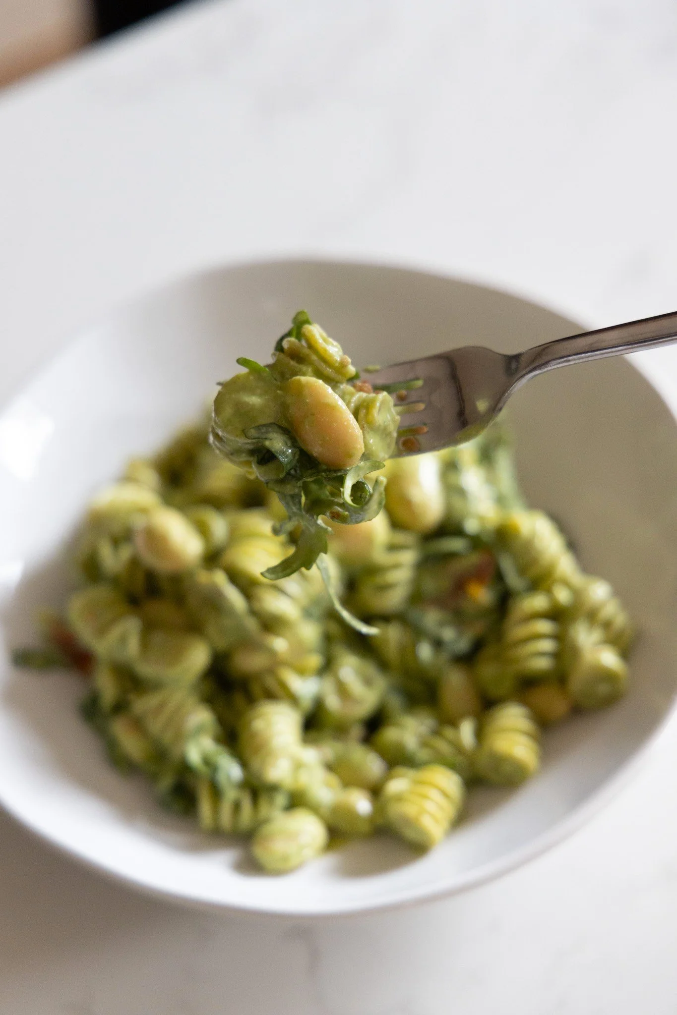 Once the pasta is cooked and drained, add it back into the pot, pour over 1/4 of the sauce, add the chopped sun-dried tomatoes, butter beans and finally the rocket salad.