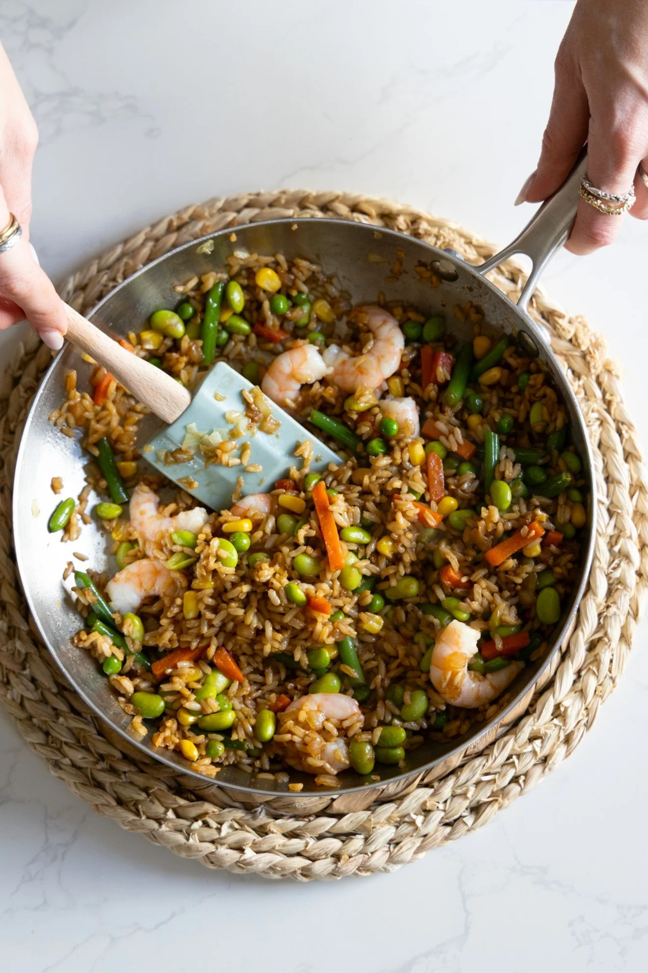 Heat a frying pan to medium-high and drizzle in olive oil. Add the frozen onion. Let it sauté for around 3 minutes until golden brown. Add the frozen veggies and edamame and fry for 5 minutes, stirring frequently. Add the cooked rice, protein of choice* and pour over the sauce. Mix and let them fry for around 3 more minutes, stir frequently.