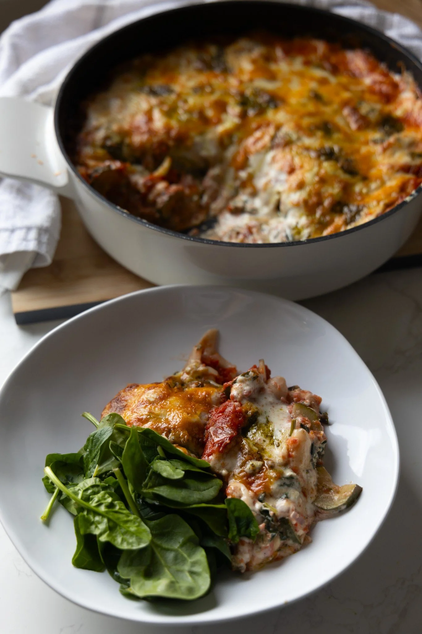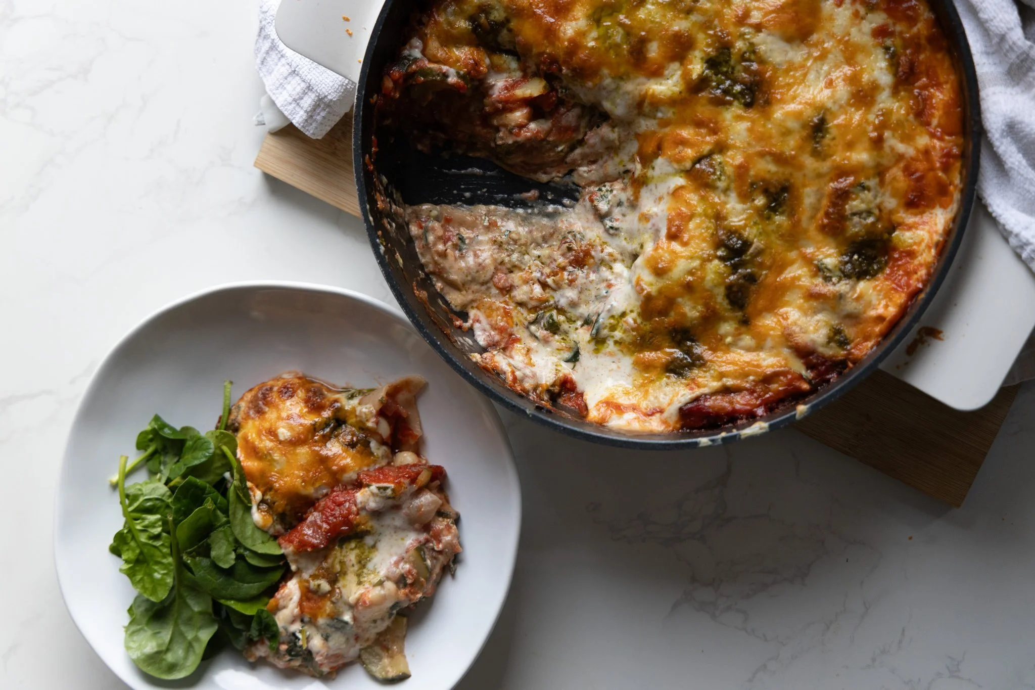 Did someone say comfort food but make it nourishing? This one pot lasagne is exactly that. It is filled with protein, fibre, healthy fats and complex carbs, and most importantly, joy! A rich tomato base, topped with a creamy ricotta and spinach layer, a béchamel sauce, dollops of delicious pesto and lots of cheese to make this the ultimate weeknight dinner.